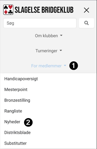 Klikker du én gang på fx "For medlemmer" (1), foldes undersiderne ud, og du skal nu vælge enten at klikke én gang til på "For medlemmer" (1), eller på fx Nyheder (2).